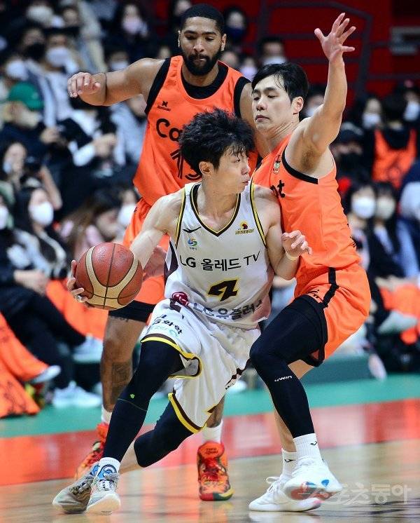 4일 경기도 고양체육관에서 열린 ‘2022-2023 SKT 에이닷 프로농구’ 고양 캐롯과 창원 LG의 경기에서 LG 이재도가 캐롯 수비를 제치며 돌파를 시도하고 있다.