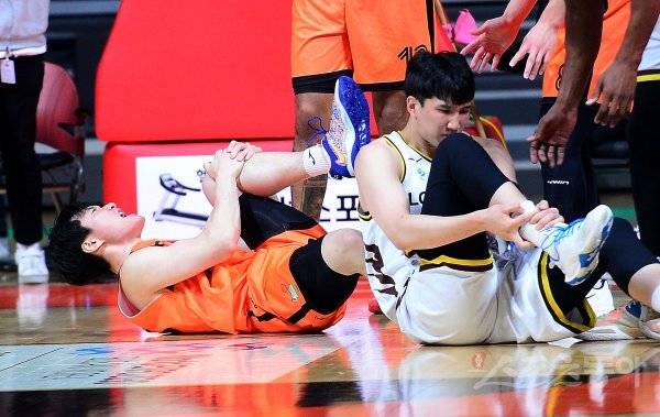 4일 경기도 고양체육관에서 열린 ‘2022-2023 SKT 에이닷 프로농구’ 고양 캐롯과 창원 LG의 경기에서 캐롯 김진유가 부상으로 고통을 호소하고 있다.