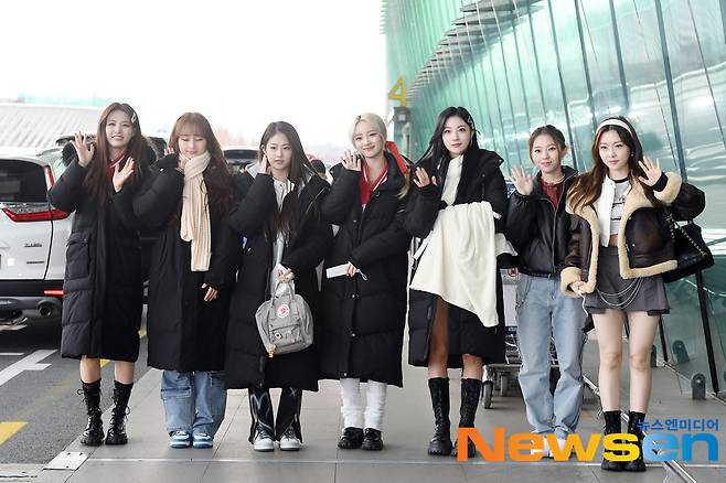 아이칠린(ICHILLIN') 멤버 지윤, 초원, 주니, 이지, 예주, 채린, 재키가 12월 4일 오후 서울 강서구 방화동 김포국제공항 국내선을 통해 제주월드컵경기장 야외 특설무대에서 진행되는 2022 K-POP in JEJU 일정 참석 차 제주도로 출발하고 있다.