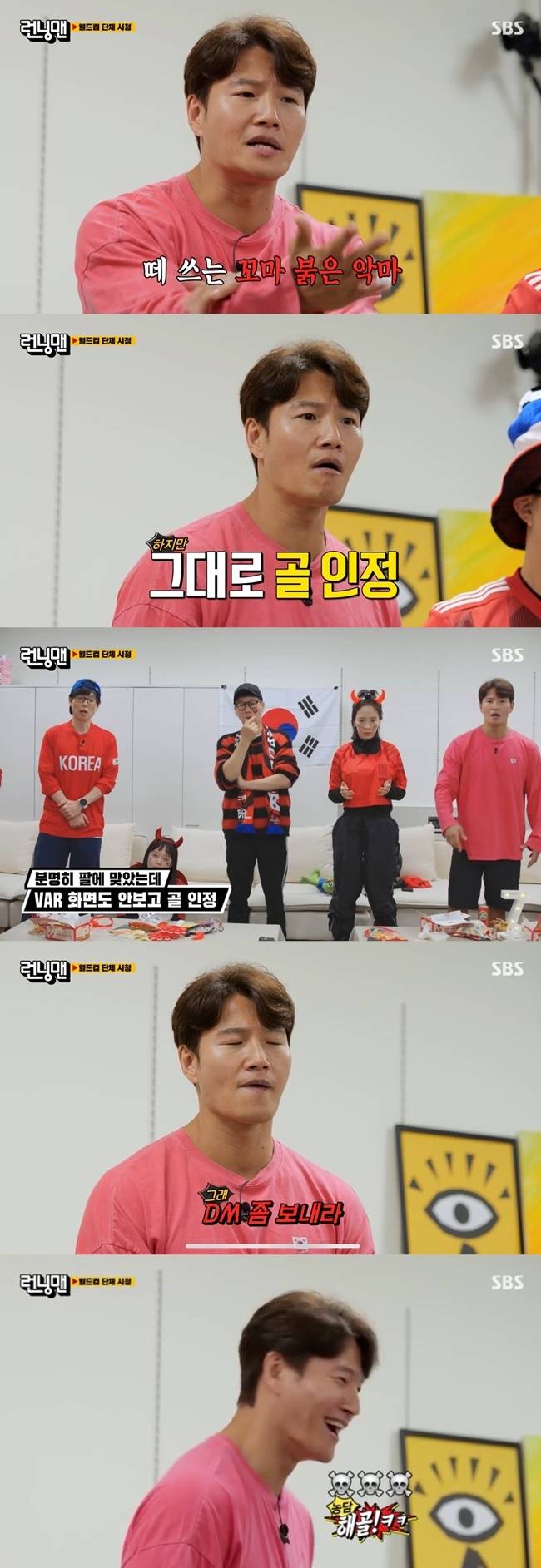 하지만 주심은 골로 인정했다. VAR 화면도 보지 않고 골을 인정한 것. 하하는 "왜 직접 안 보냐. DM 보내야겠다"고 발끈했고, 김종국은 "DM 좀 보내라. 대변하고 해골 알지"라고 거들었다.