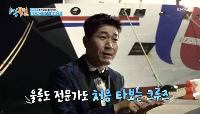 이후 크루즈에 오른 김종민은 엘리베이터, TV 등을 갖춘 내부를 보고 감탄했다. 그러나 정작 본인의 객실은 침대도 없는 다인실 온돌방으로 결정돼 김종민을 좌절하게 했다.
