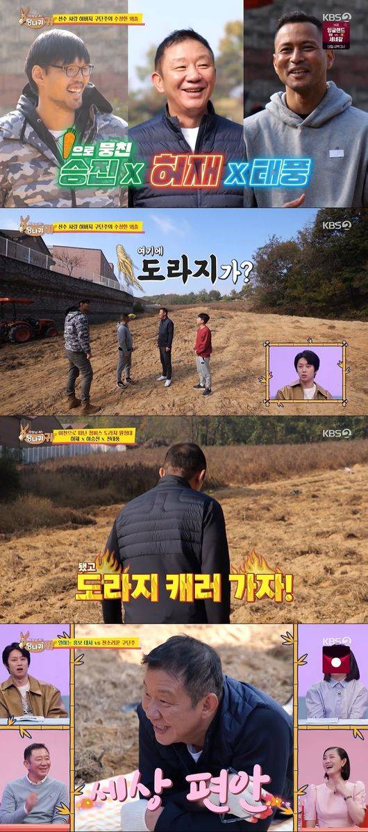 허재는 국제업무담당, 하승진, 전태풍과 함께 넓은 밭에 도착했다. 선수들에게 좋은 걸 해주고 싶다는 허재는 “감독할 때 너희에게 잘 해주지 못했다. 보양식 같은 것도 못해줬는데, 여기에 몸에 좋은 도라지가 많다”고 말했다. 허재는 이들과 함께 도라지를 직접 캐기 위해 나섰다. /elnino8919@osen.co.kr