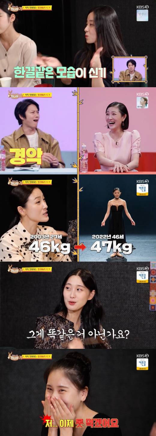 김주원은 “발레단에서 한참 ‘백조의 호수’하고 이럴 때 46kg였고, 지금은 한 47kg 정도다”라며 2003년 27세이던 당시와 46세인 현재의 몸무게 차이에 대해 털어놨다.