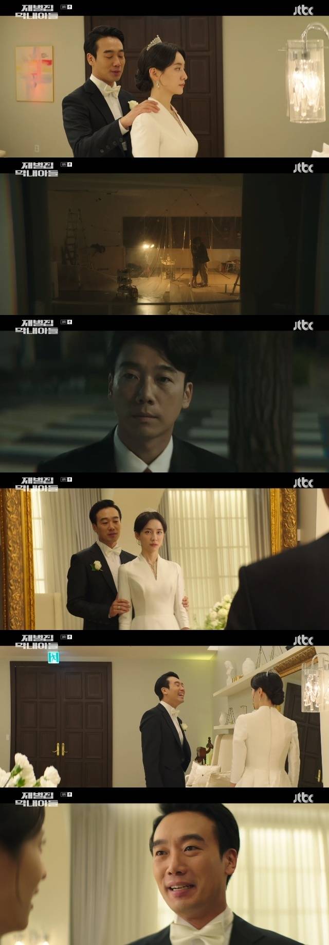 모현빈은 결국 결혼식에 입장했다. 그러면서 그는 남들 몰래 진성준에게 "하나만 약속하라. 호적만큼은 더럽히지 않겠다고"라는 다짐을 받았다. (사진=JTBC '재벌집 막내아들' 캡처)
