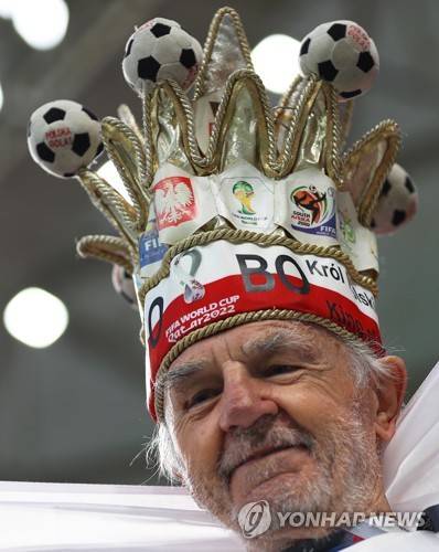epa10347800 A fan of Poland attends the FIFA World Cup 2022 round of 16 soccer match between France and Poland at Al Thumama Stadium in Doha, Qatar, 04 December 2022. EPA/Ali Haider