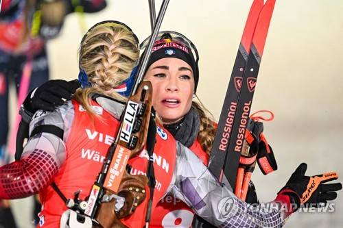 epa10347815 Dorothea Wierer (R) of Italy in finish area at the women's 10km Pursuit race of the IBU Biathlon World Cup in Kontiolahti, Finland, 04 December 2022. EPA/KIMMO BRANDT