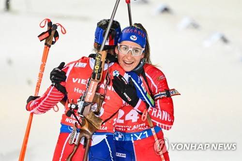 epa10347812 Julia Simon (L) of France and Caroline Colombo (R) of France in finish area at the women's 10km Pursuit race of the IBU Biathlon World Cup in Kontiolahti, Finland, 04 December 2022. EPA/KIMMO BRANDT
