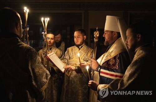 Metropolitan Oleksandr delivers a religious service with clerics inside the Transfiguration of Jesus Orthodox Cathedral during blackout caused by recent Russian rocket attacks, in Kyiv, Ukraine, Saturday, Dec. 3, 2022. A top Orthodox priest in Ukraine's capital says he supports the efforts of President Volodymyr Zelenskyy's government and counter-intelligence agency to end Russian spying and meddling in Ukrainian politics through a Moscow-affiliated church. (AP Photo/Efrem Lukatsky)