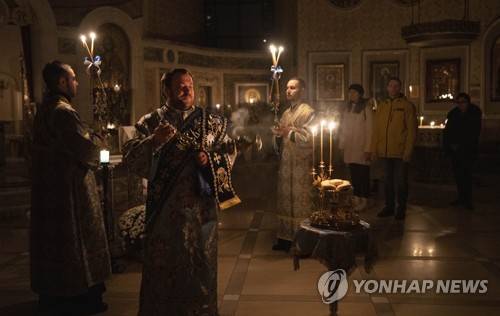 Priests deliver a religious service inside the Transfiguration of Jesus Orthodox Cathedral during blackout caused by recent Russian rocket attacks, in Kyiv, Ukraine, Saturday, Dec. 3, 2022. A top Orthodox priest in Ukraine's capital says he supports the efforts of President Volodymyr Zelenskyy's government and counter-intelligence agency to end Russian spying and meddling in Ukrainian politics through a Moscow-affiliated church. (AP Photo/Efrem Lukatsky)