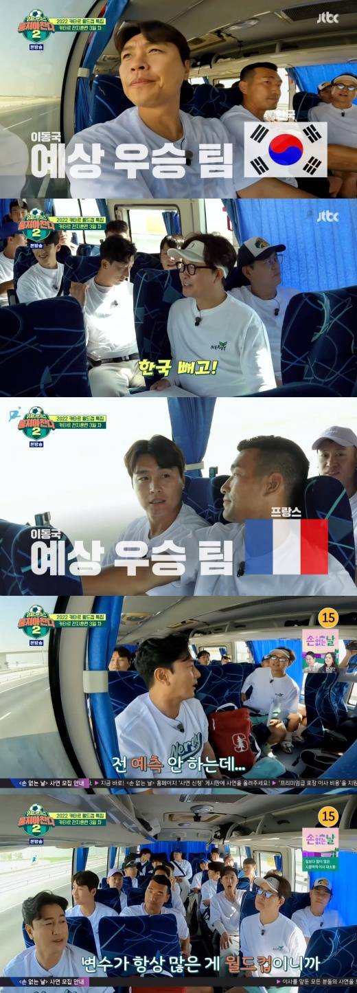 4일 밤 방송된 종합편성채널 JTBC 예능 프로그램 ‘뭉쳐야 찬다2’에서는 선수들과 함께 2022 카타르 월드컵 우승 팀 맞히기를 하는 모습이 그려졌다.