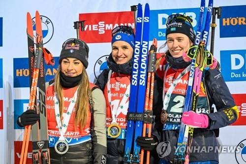 epa10347861 Second placed Dorothea Wierer of Italy (L), winner Julia Simon of France (C) and third placed Elvira Oeberg of Sweden (R) celebrate on the podium after the women's 10km Pursuit race of the IBU Biathlon World Cup in Kontiolahti, Finland, 04 December 2022. EPA/KIMMO BRANDT