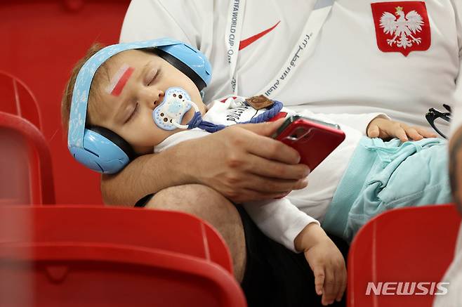 [도하(카타르)=뉴시스] 백동현 기자 = 4일(현지시간) 오후 카타르 도하 알투마마 스타디움에서 열린 2022 카타르 월드컵 16강전 프랑스와 폴란드의 경기, 킥오프 전 폴란드 축구 팬 어린이가 부모 품에서 자고 있다. 2022.12.05. livertrent@newsis.com