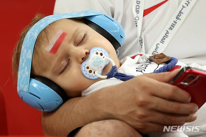 [도하(카타르)=뉴시스] 백동현 기자 = 4일(현지시간) 오후 카타르 도하 알투마마 스타디움에서 열린 2022 카타르 월드컵 16강전 프랑스와 폴란드의 경기, 킥오프 전 폴란드 축구 팬 어린이가 부모 품에서 자고 있다. 2022.12.05. livertrent@newsis.com