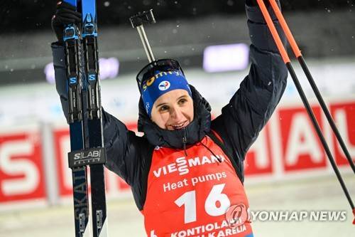 epa10347868 Julia Simon of France celebrates on the podium after winning the women's 10km Pursuit race of the IBU Biathlon World Cup in Kontiolahti, Finland, 04 December 2022. EPA/KIMMO BRANDT