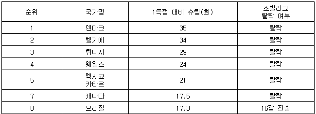 유효슈팅 수 대비 득점을 봐도 사정은 다르지 않다. 유효슈팅 7개당 1골을 기록한 셈인데, 이 역시 16강 진출 팀 중에서는 가장 나쁜 수치다.