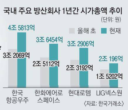 4일 업계에 따르면 지난 1년간 한국항공우주산업(KAI)·한화에어로스페이스·현대로템·LIG넥스원 등 국내 주요 방산업체의 시가총액은 회사별로 30~40%씩 상승했다.