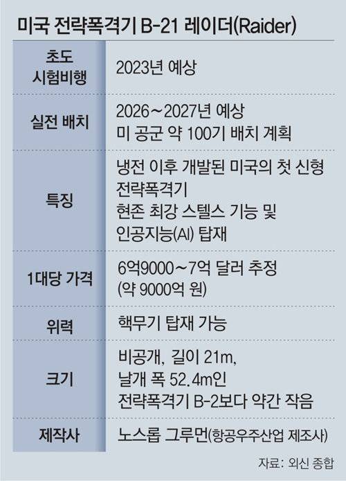 미국은 현재 세계 유일의 스텔스 전략폭격기인 ‘B-2 스피릿’을 운용하고 있다. B-21은 1989년 7월 B-2의 초도비행 이후 30여 년 만에 개발된 새 스텔스 폭격기다. B-21은 적국의 대공 감시망을 무력화할 강력한 스텔스 능력을 갖췄다고 미 언론은 전했다. 폭 52.4m의 B-2가 레이더에 새 정도의 크기로 탐지된다면 B-21은 골프공 크기로 인식돼 언제든 들키지 않고 적진에 날아가 핵무기를 투하할 수 있다는 것이다.