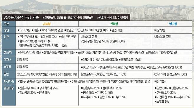 공공주택이 3개 유형으로 구분되면서 입주자 선정 방식도 많이 복잡해졌지만, 수요자라면 당락을 결정짓는 기본적인 규칙을 파악해둘 필요가 있다. 먼저 나눔형 청년 특공은 근로기간(소득세 납부 기준)이 5년 이상인 청년에게 30%를 우선 공급한다. 우선 공급에선 본인 소득(70% 이하 3점)과 해당 지역 연속 거주기간(2년 이상 3점), 청약통장 납입횟수(24회 이상 3점) 등을 따져 배점제(9점 만점)로 공급한다. 잔여 물량은 우선공급 3개 항목에 근로기간(5년 이상 3점)을 더해 배점제(12점 만점)로 공급한다.