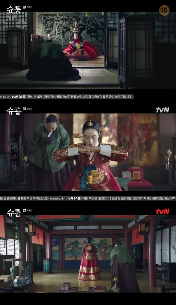 12월 4일 방송된 tvN 토일드라마 ‘슈룹’ 16회(마지막회/극본 박바라/연출 김형식)에서 대비(김해숙 분)는 왕비 대례복을 입고 마지막을 장식했다.
