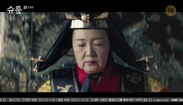 12월 4일 방송된 tvN 토일드라마 '슈룹' 16회(마지막회/극본 박바라/연출 김형식)에서 대비(김해숙 분)는 왕비 대례복을 입고 마지막을 장식했다.