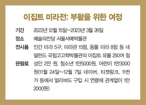 네덜란드 국립고고학박물관의 이집트 유물을 선보이는 '이집트 미라전: 부활을 위한 여정' 전시회가 12월 15일부터 서울 서초구 예술의전당 서울서예박물관에서 3개월 여 간 열린다.