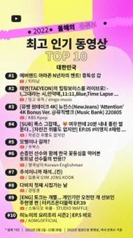올해 인기 동영상 2위에는 가수 태연의 라이브 장면을 담은 '태연(TAEYEON)의 킬링보이스를 라이브로!'(딩고뮤직) 영상이 올랐다. 3위는 걸그룹 뉴진스의 '어텐션'무대 영상(KBS Kpop)이 차지했다.