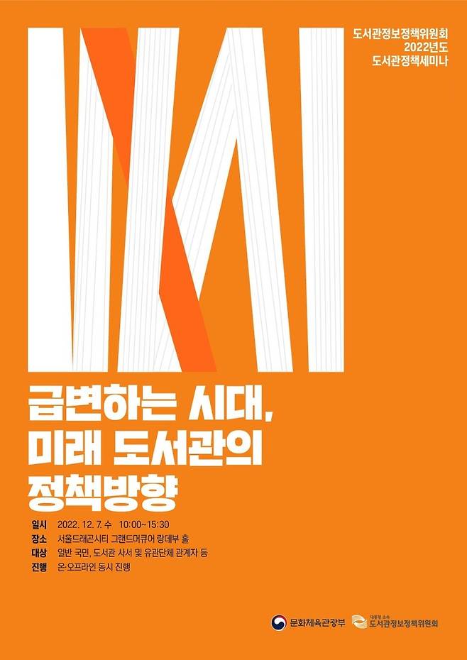 도서관정보정책위원회는 오는 7일 서울드래곤시티 그랜드 머큐어 랑데부홀에서 '급변하는 시대, 미래 도서관의 정책방향'을 주제로 '2022년도 도서관정책세미나'를 개최한다.