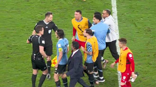 이후 우루과이 대표팀은 경기장을 빠져나갔지만, 우루과이 공격수 에딘손 카바니가 주심이 사용하는 '비디오 판독(VAR) 모니터'를 밀어 넘어뜨렸습니다.