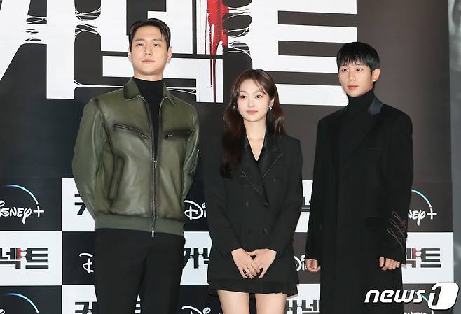 (서울=뉴스1) 권현진 기자 = 배우 고경표(왼쪽부터)와 김혜준, 정해인이 5일 서울 용산구 CGV용산아이파크몰에서 열린 디즈니+의 오리지널 시리즈 '커넥트' 에피소드 언론시사 및 기자간담회에서 포즈를 취하고 있다.