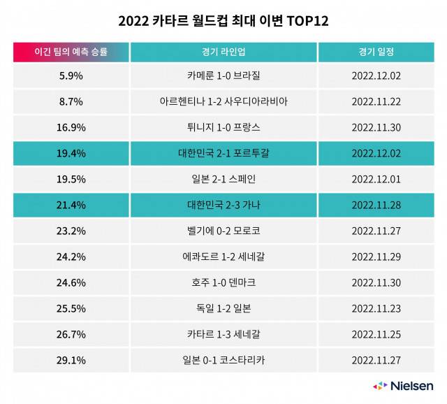 글로벌 미디어 정보 분석 기업 닐슨미디어코리아가 2022 카타르 월드컵 최대 이변 12경기를 발표했다.