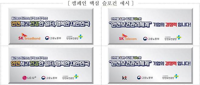 통신 4사는 대국민 안전보건 의식을 향상하기 위해 업무용 차량 총 3500대에 '안전하고 건강한 일터, 행복한 대한민국' '안전을 위한 우리를 WE한, 안전보건관리체계 정착' 등 캠페인 핵심 슬로건을 부착·운행한다.