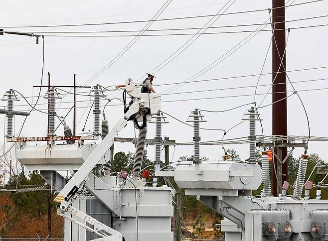 [현지시간 4일 미국 노스캐롤라이나주 카르타고의 마비된 변전소를 복구하기 위해 작업 중인 직원들 (로이터=연합뉴스)]
