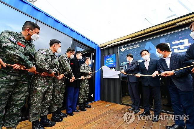 (서울=연합뉴스) 5일 오전 제주 해군기지에서 열린 제7기동전단 인공지능(AI)·소프트웨어(SW) 교육장인 'Navy AI HUB' 개소식에서 이종호 해군 참모총장(왼쪽 다섯 번째), 강완구 국방부 기획조정실장(오른쪽 세 번째), 강도현 과학기술정보통신부 정보통신정책실장(오른쪽 두 번째) 등 주요 관계자가 참가한 가운데 현판식이 진행되고 있다. 2022.12.5 [해군 제공. 재판매 및 DB 금지]