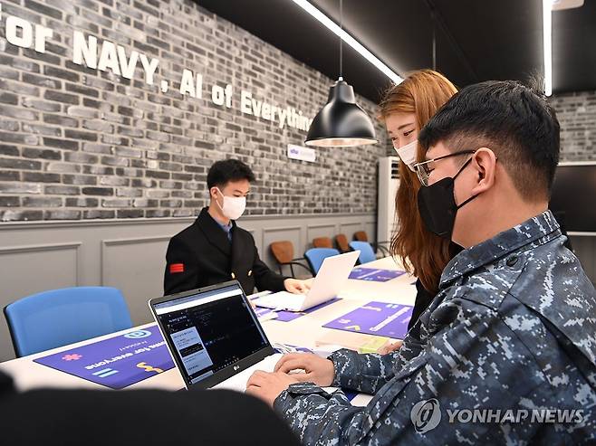 (서울=연합뉴스) 해군 제7기동전단 장병들이 5일 개소한 인공지능(AI)·소프트웨어(SW) 교육장 'Navy AI HUB'에서 교육을 받고 있다. 2022.12.5 [해군 제공. 재판매 및 DB 금지]