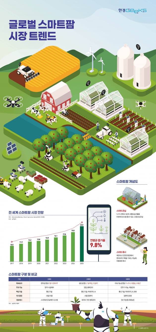 스마트팜은 인공지능(AI)과 같은 최첨단 기술을 융합해 작물과 가축을 원격으로 키워낼 수 있는 농장을 말합니다. 스마트팜 기술은 6차 산업의 대표적 기술입니다. 6차 산업은 농업 융복합산업을 말합니다. 1차 산업(농림수산업), 2차 산업(제조업), 3차 산업(서비스업)을 모두 융합한(1x2x3=6) 형태라 해서 6차라는 이름을 붙입니다.