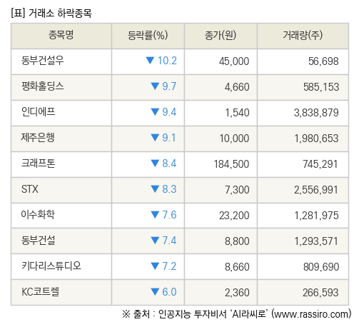 [fnRASSI]장마감, 거래소 하락 종목(동부건설우 -10.2% ↓)