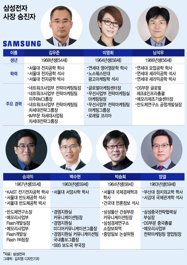 이번 사장단 인사는 인재와 기술을 중시하는 이 회장의 경영철학을 바탕에 두고 과감한 기술인재 발탁에 방점을 찍었다. 7명의 승진자 중 6명이 50대다. 우선 삼성전자 DX부문 네트워크사업부 전략마케팅팀장을 맡았던 김우준(54) 부사장이 네트워크사업부장 사장으로 승진했다. 이번 사장 승진자 중 가장 젊다. 서울대 전자공학 박사 출신으로 삼성전자 네트워크사업부 상품전략그룹장, 차세대전략그룹장, 전략마케팅팀장 등 주요 보직을 역임하면서 영업·기술·전략 등 다양한 분야에 걸쳐 비즈니스 성장을 주도했다는 평가를 받는다.
