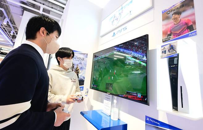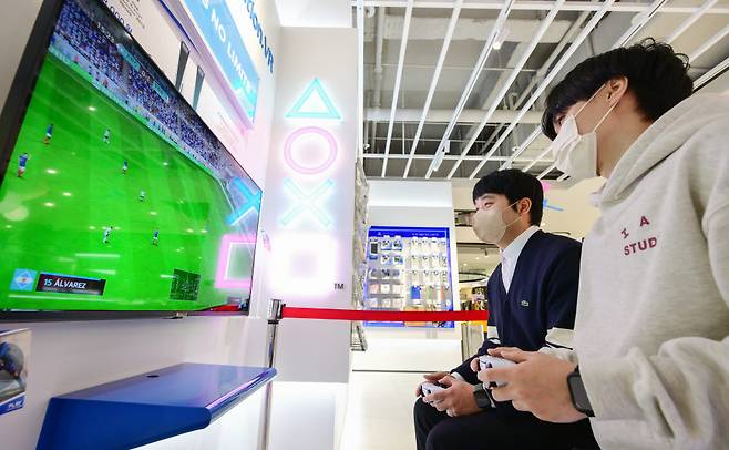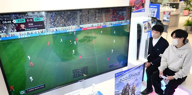 12년 만의 16강 진출로 뜨거워진 월드컵 열기가 '축구게임'으로 이어지고 있다. 5일 서울 송파구 롯데하이마트 메가스토어에서 소비자가 콘솔 게임 '피파23'을 체험하고 있다.