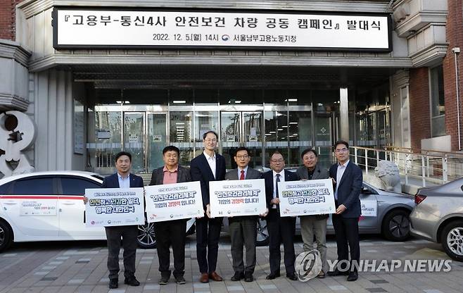 (서울=연합뉴스) 5일 서울 영등포구 고용노동부 서울남부지청에서 열린 '통신4사-고용노동부 안전보건 차량 캠페인 발대식'에 참석한 관계자들이 캠페인에 참여하는 차량 앞에서 기념 촬영하고 있다. 왼쪽부터 김건우 LG유플러스 CSEO, 강종렬 SK텔레콤 CSPO(사장), 박종욱 KT 안전보건총괄(사장), 류경희 고용노동부 산업안전보건본부장, 송병춘 안전보건공단 경영이사, 최승원 SK브로드밴드 CSPO, 금정수 고용노동부 산재예방지원과장. 2022.12.5 [한국산업안전보건공단 제공. 재판매 및 DB 금지]