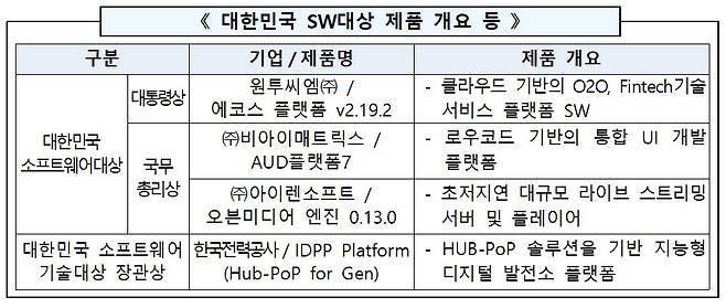 대한민국 SW대상은 원투씨엠(에코스 플랫폼 v2.19.2)이 대통령상을, 비아이매트릭스(AUD플랫폼7)와 아이렌소프트(오븐미디어 엔진 0.13.0)가 국무총리상을, 대한민국 SW 기술대상은 한국전력공사(IDPP Platform)가 과기정통부장관상을 수상했다.