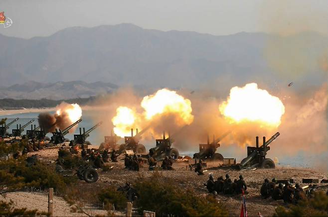 [지난 20년 3월 북한의 조선중앙TV가 김정은 국방위원장이 현지 지도했다고 보도한 포병부대들의 포사격 대항 경기의 모습. (연합뉴스 자료사진)]