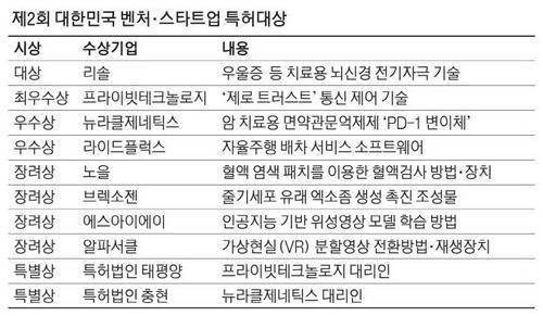 인류가 아직 정복하지 못한 알츠하이머 질환을 전기 자극을 통해 치료할 수 있는 가능성을 제시한 리솔이 '제2회 대한민국 벤처·스타트업 특허대상'에서 대상의 영예를 안았다. 새로운 차원의 사이버 보안 기술을 보유한 기업과 자율주행 소프트웨어 업체 등에도 상이 주어졌다.