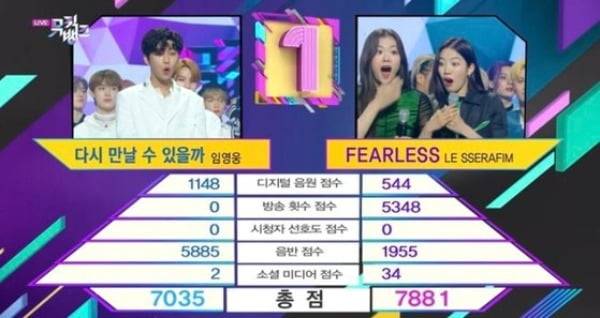 첫사랑의 1위 전 르세라핌이 임영웅을 제치고 1위에 올라 논란이 됐다. 임영웅의 음원, 음반 성적은 르세라핌에 비해 압도적이었다. 특히 임영웅은 음반을 110만 장 넘게 팔았고, 르세라핌의 음반은 초동 기준 30만 장을 겨우 돌파했을 뿐이었다.