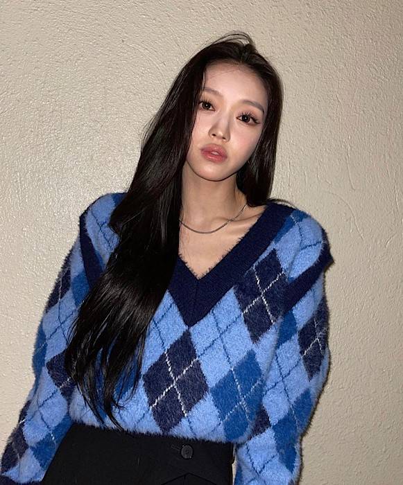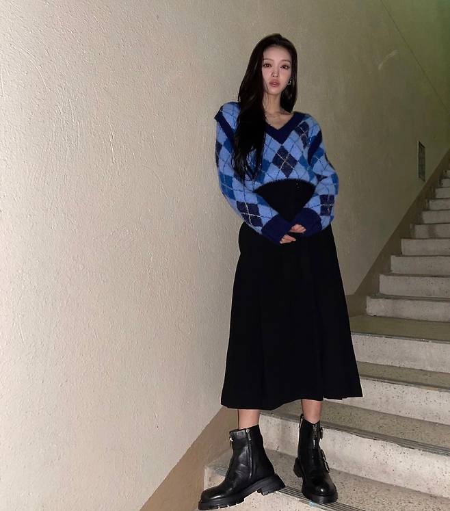 공개된 사진에는 계단에서 포즈를 취하고 있는 유아의 모습이 담겼다. 브이라인이 깊게 파진 아가일 패턴의 니트를 입어 움푹 파인 쇄골을 뽐내고 있다.
