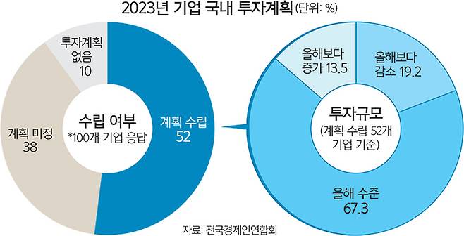 전국경제인연합회는 지난달 17~25일 모노리서치에 의뢰해 매출 500대 기업을 대상으로 2023년 국내 투자계획을 물은 결과, 응답 기업(100개사)의 48%가 내년도 투자 계획이 없거나(10%) 아직 계획을 세우지 못한(38%) 것으로 나타났다고 5일 밝혔다.
