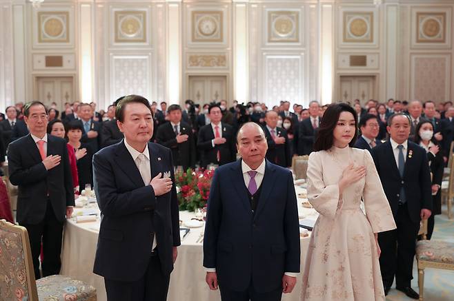 [서울=뉴시스] 윤석열 대통령과 부인 김건희 여사가 5일 청와대 영빈관에서 열린 응우옌 쑤언 푹 베트남 국가주석 방한 국빈만찬에서 국기에 대한 경례를 하고 있다. (사진=대통령실 제공) 2022.12.05. photo@newsis.com *재판매 및 DB 금지