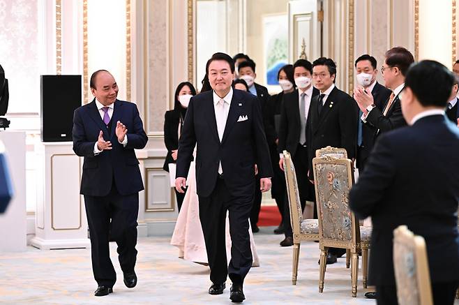 [서울=뉴시스] 윤석열 대통령이 5일 청와대 영빈관에서 열린 국빈만찬에 응우옌 쑤언 푹 베트남 국가주석과 함께 입장하고 있다. (사진=대통령실 제공) 2022.12.05. photo@newsis.com *재판매 및 DB 금지