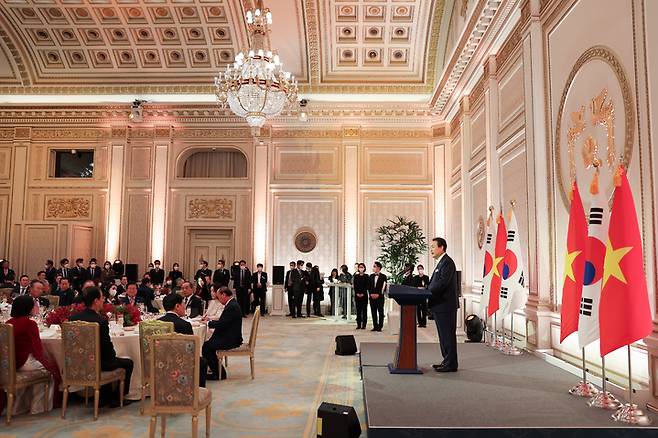 [서울=뉴시스] 윤석열 대통령이 5일 청와대 영빈관에서 열린 응우옌 쑤언 푹 베트남 국가주석 방한 국빈만찬에서 만찬사하고 있다. (사진=대통령실 제공) 2022.12.05. photo@newsis.com *재판매 및 DB 금지