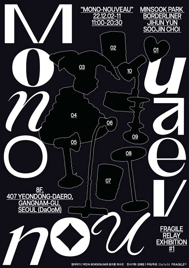 프래자일(FRAGILE)은 다움(DaOoM)과 함께 'FRAGILE RELAY EXHIBITION'을 개최한다. 전시는 총 세 번으로 'Mono - Nouveau'를 시작으로 'Still Moments', 'Rectangle'로 구성된다.