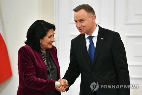 epa10349574 Polish President Andrzej Duda (R) and Georgian President Salome Zourabichvili (L) during a press conference after their meeting at the Presidential Palace in Warsaw, Poland, 05 December 2022. EPA/RADEK PIETRUSZKA POLAND OUT